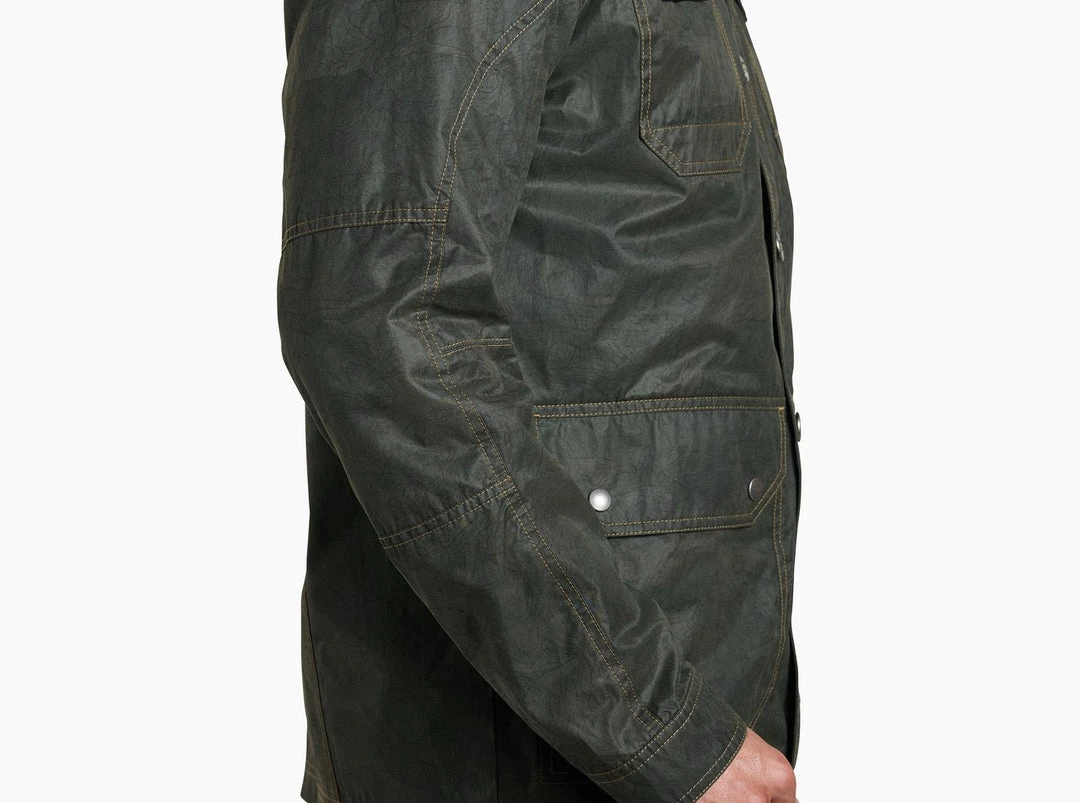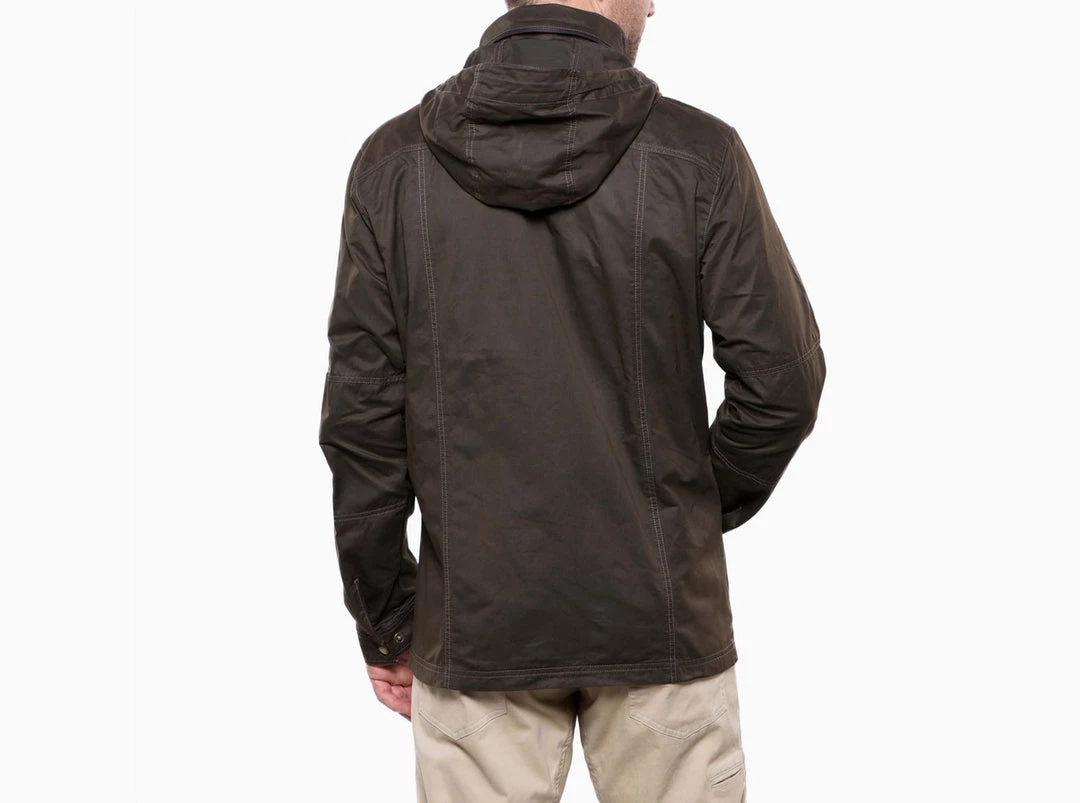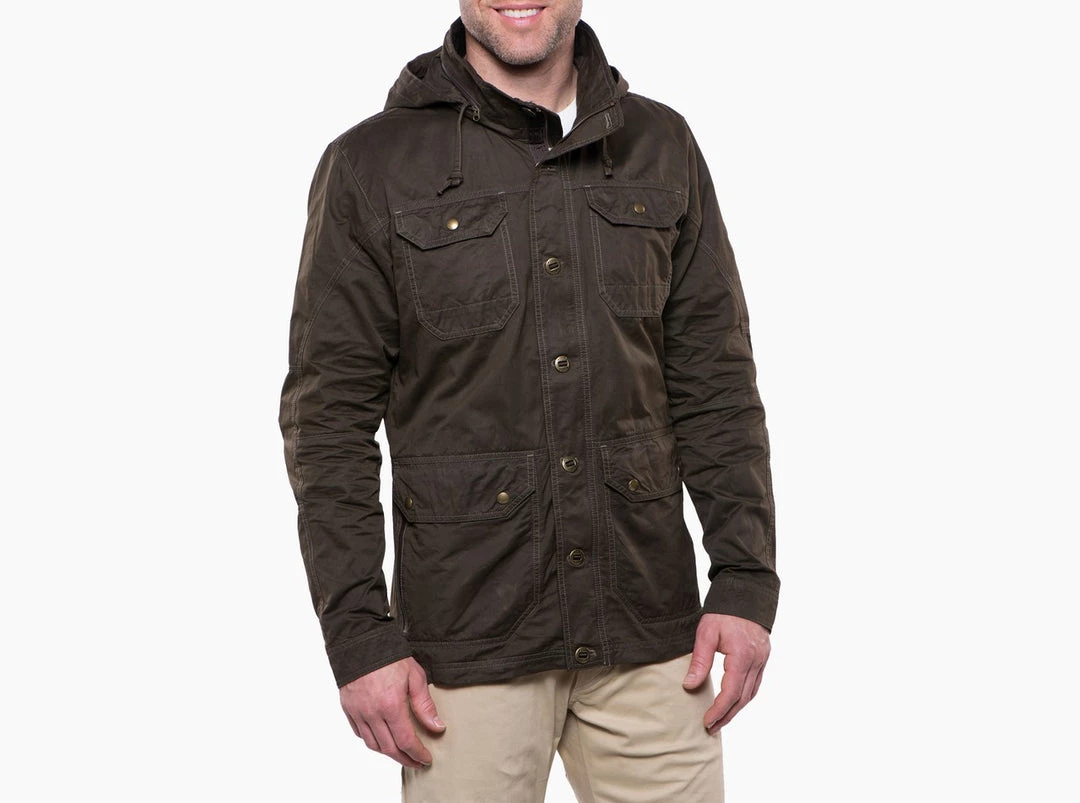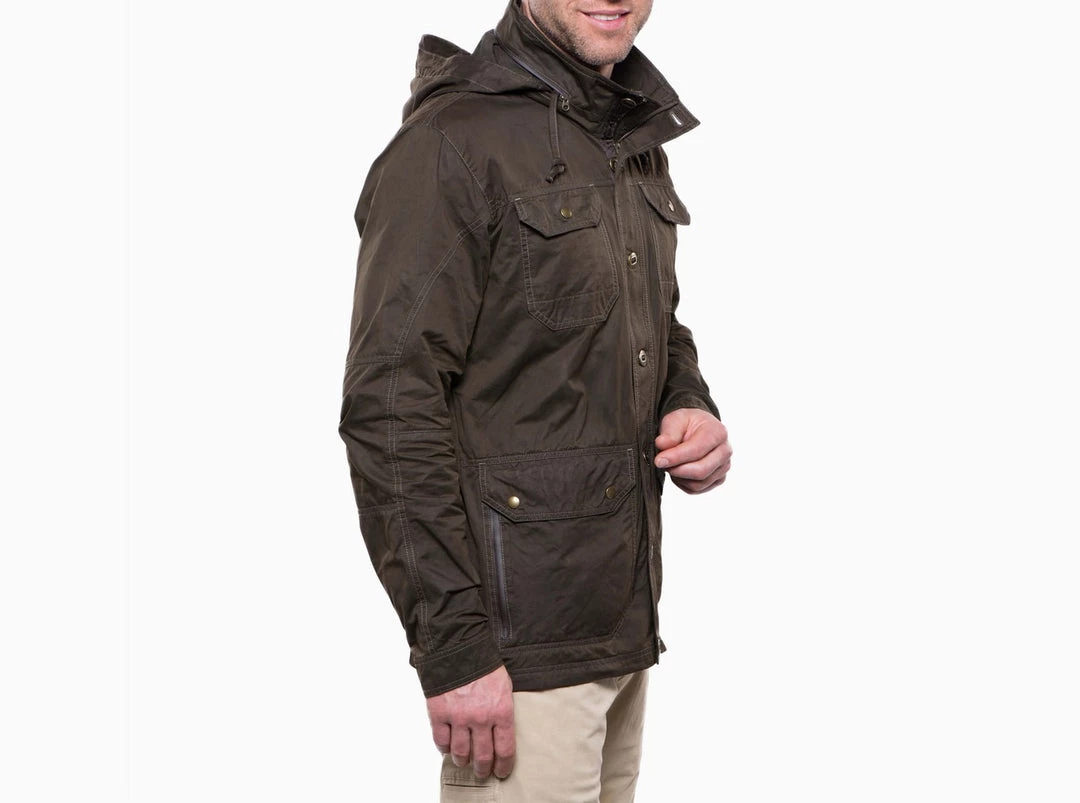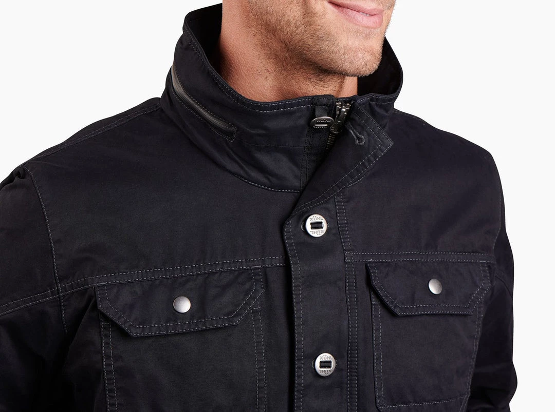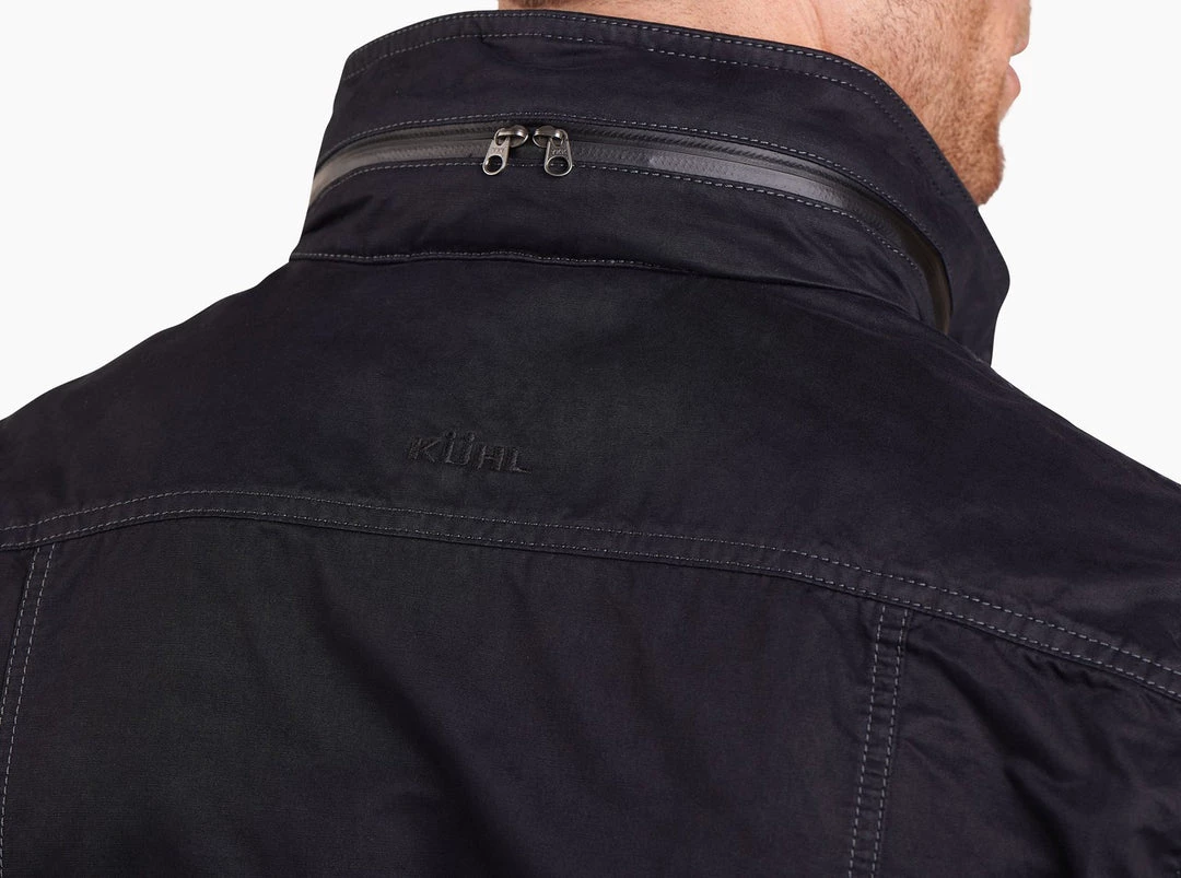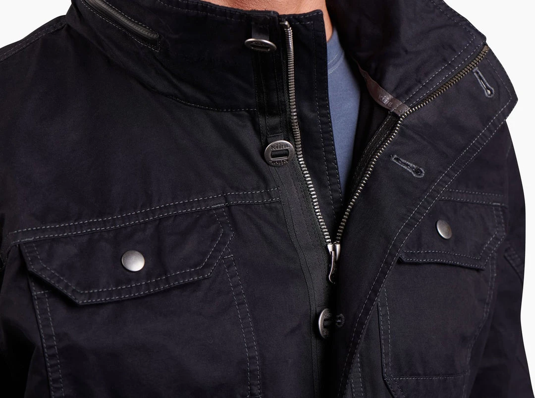 The KÜHL KOLLUSION™ Men’s Jacket is designed to shut out the elements……..in style. Our water-resistant, yet breathable fabric employs a Polyurethane and synthetic wax coating for rugged water and wind resistance. A full front zipper behind an outer draft flap with bar button closure seals the deal. Two snap closure chest pockets and two hand pockets with snap closures on the top and a zippered side entry provide secure storage.